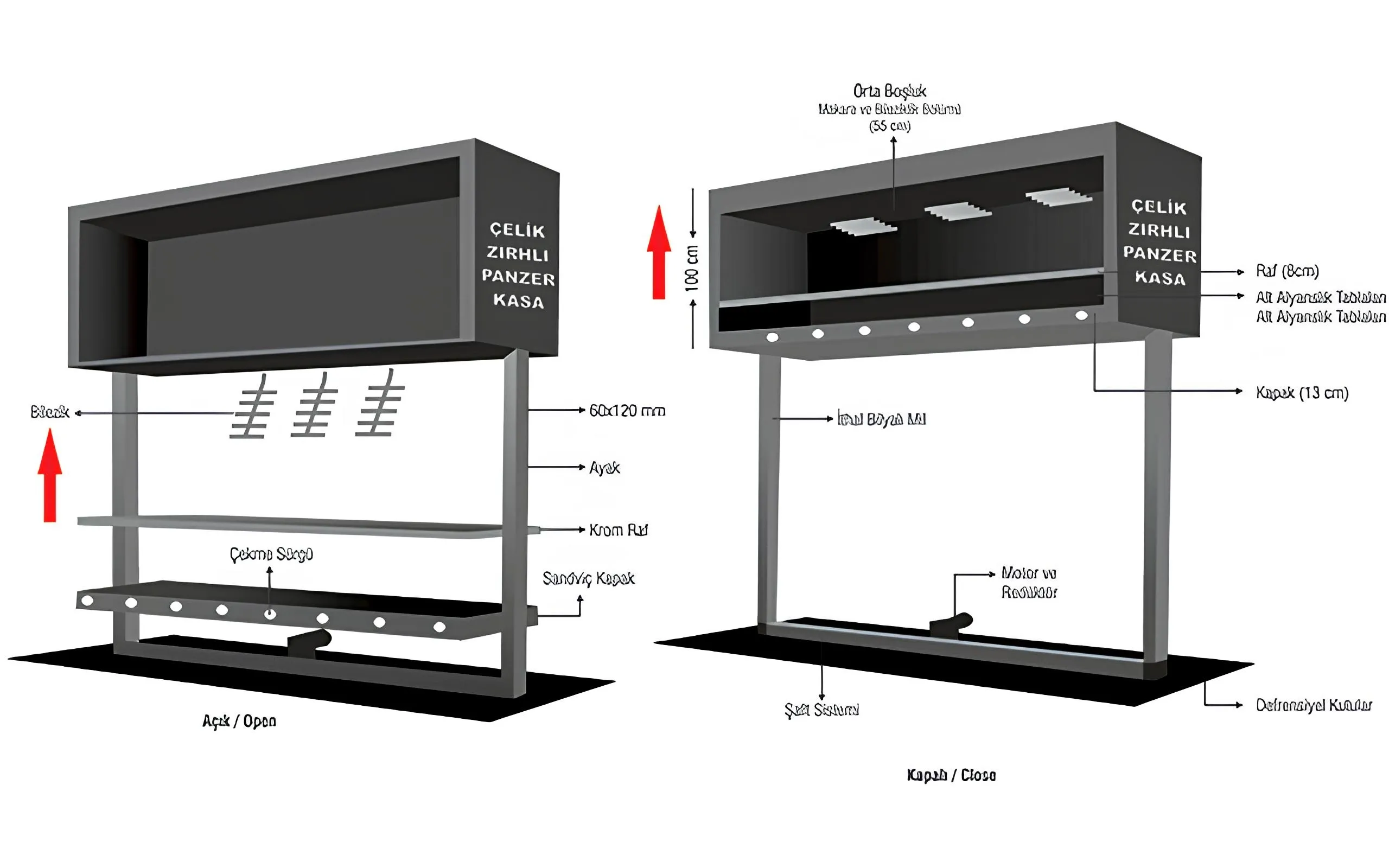 Yukarı Katlanır Asansörlü Vitrin Kasalarımız katlanabilme özelliğine sahip olup darbe ve oluşabilecek yüksek basınçlara dayanıklı olarak imal edilmektedir.